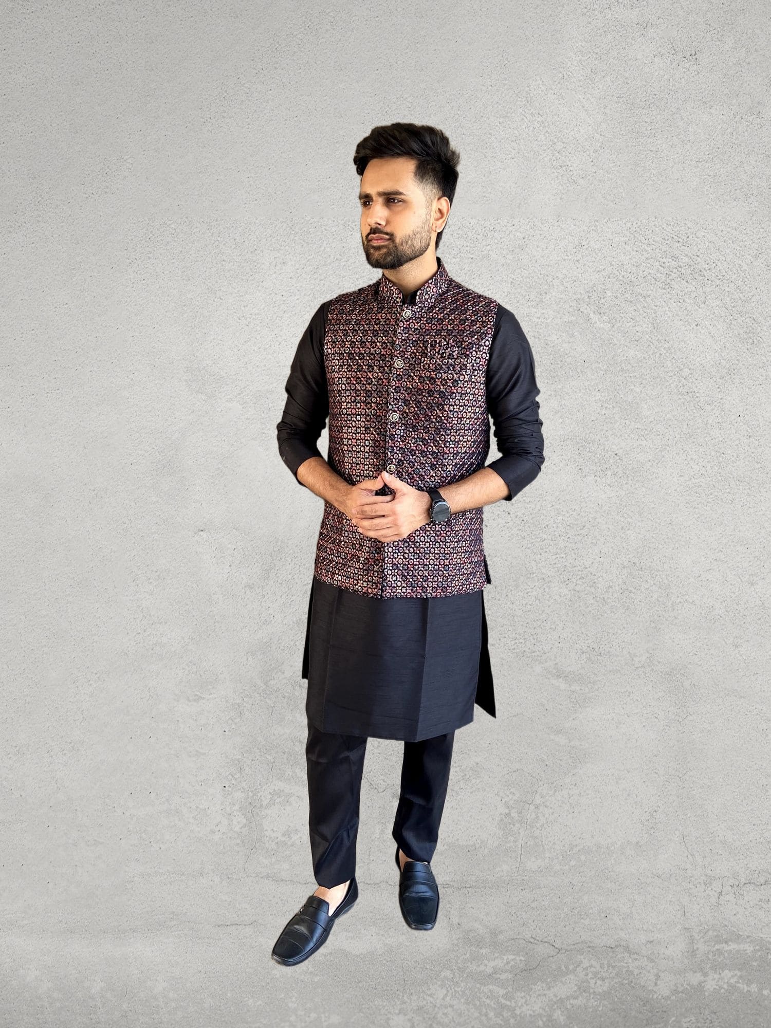 Premium silk quality kurta with embroidery on nehru jacket and comes with pants