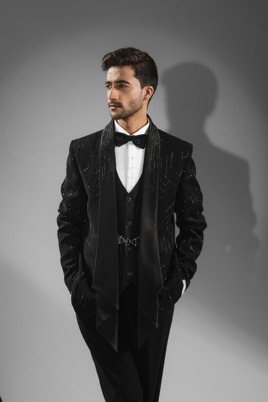 Black tuxedo with cutdana embroidery and detachable lapel