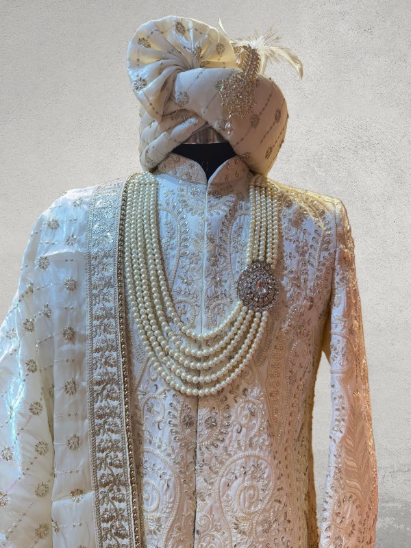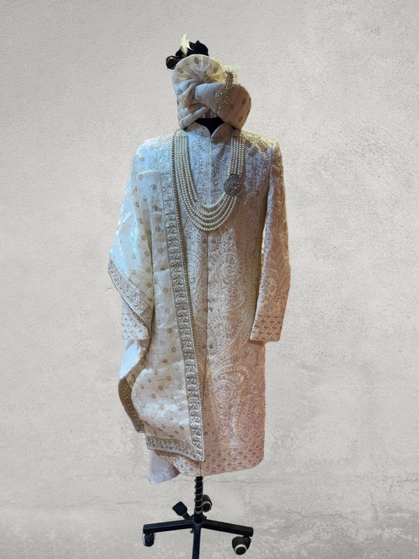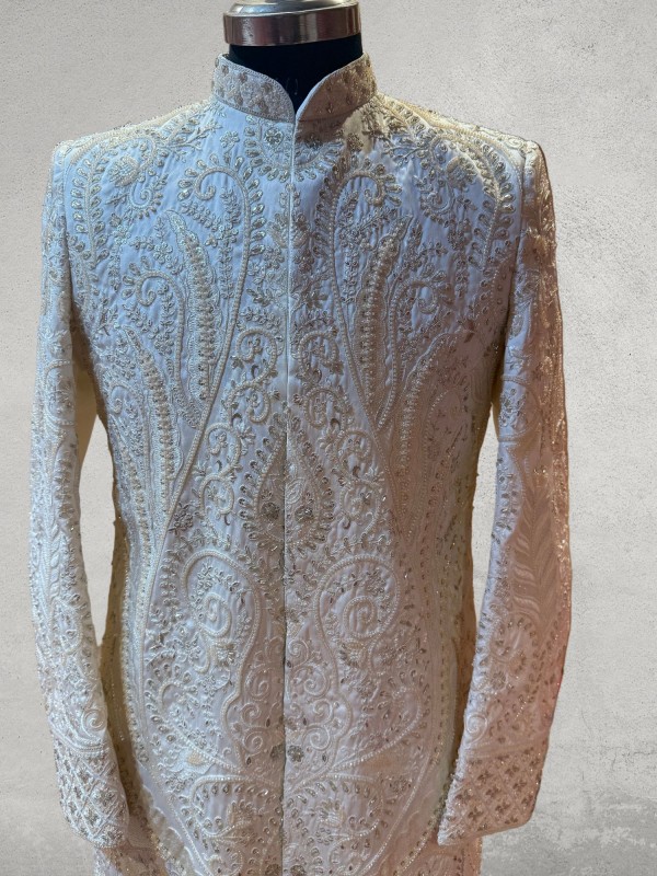 Groom's Zardozi & Dabka Sherwani: Make a statement on your wedding day with our hand-embroidered sherwanis. Each piece showcases exquisite zardozi, dabka, and cutdana work, adding a touch of royalty and luxury to your look.
