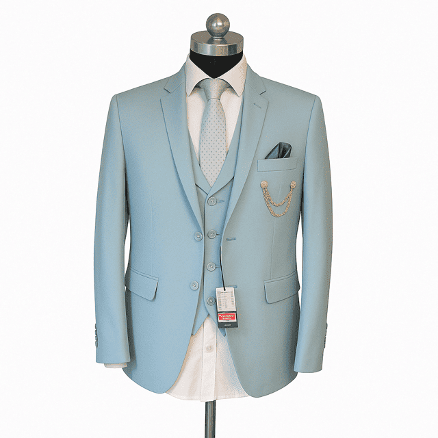 Made in textured Japanese stretchable fabric, this 5-piece suit comes with vest, pant, tie, pocket square, broach, and shirt � stylish and versatile.
