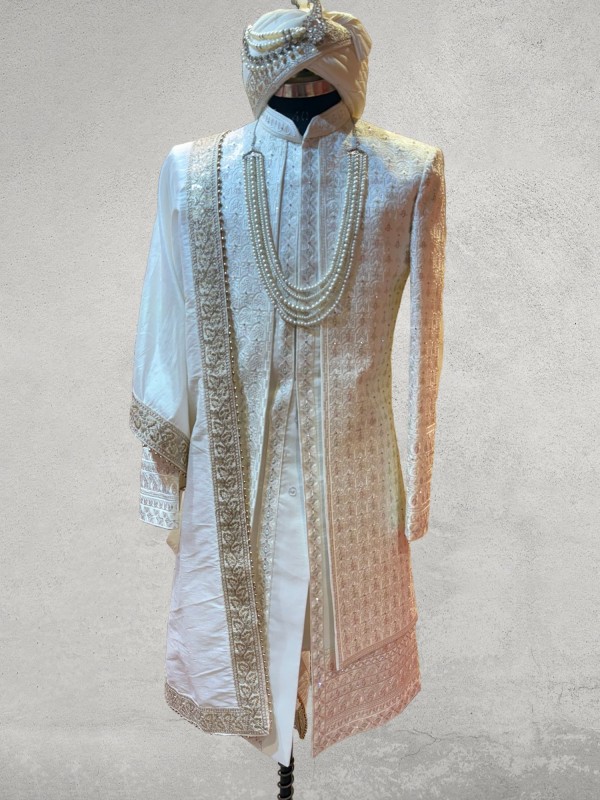 Make a grand entrance with our stunning multicolor zarkan embroidered open-pattern sherwani. This designer piece features intricate zarkan work in vibrant hues, creating a unique and modern look that's perfect for the fashion-forward groom. Shop this exclusive style and stand out on your special day.  Comes along with complimentary pagdi, shawl , pants, maala and jooti.