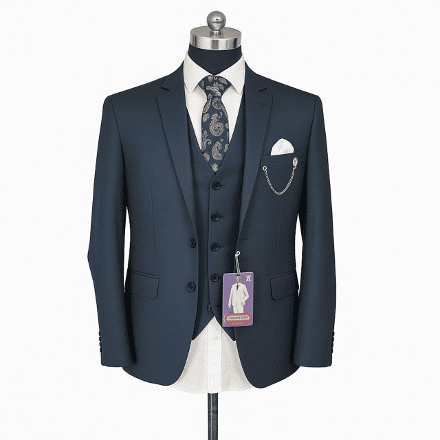 Tailored in Japanese stretchable fabric, this navy blue 5-piece suit includes a vest, pant, tie, pocket square, broach, and shirt � a timeless formalwear staple.