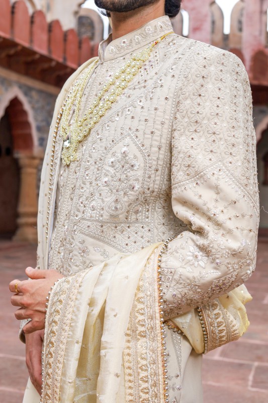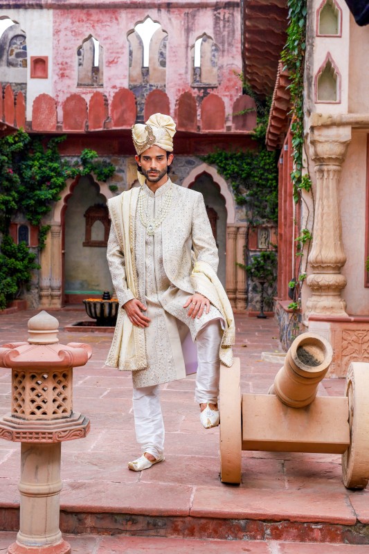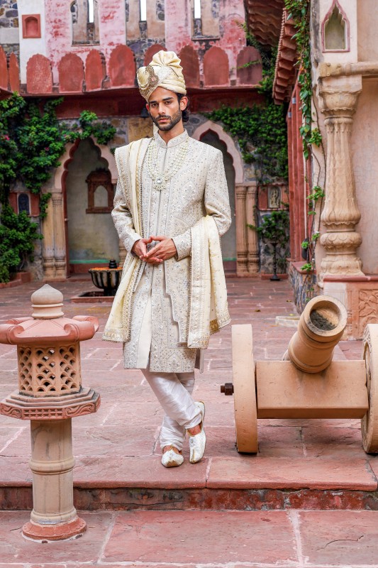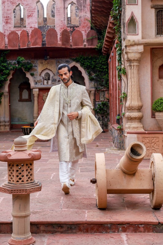 Draped in luxury, this Pista Sherwani exudes royal elegance. Comes with a pagdi, shawl, pajama, maala, and jooti.