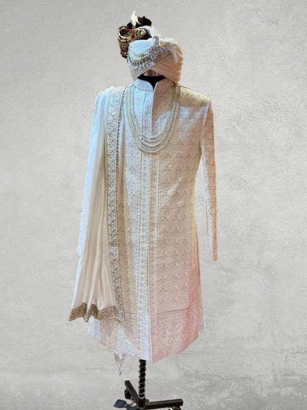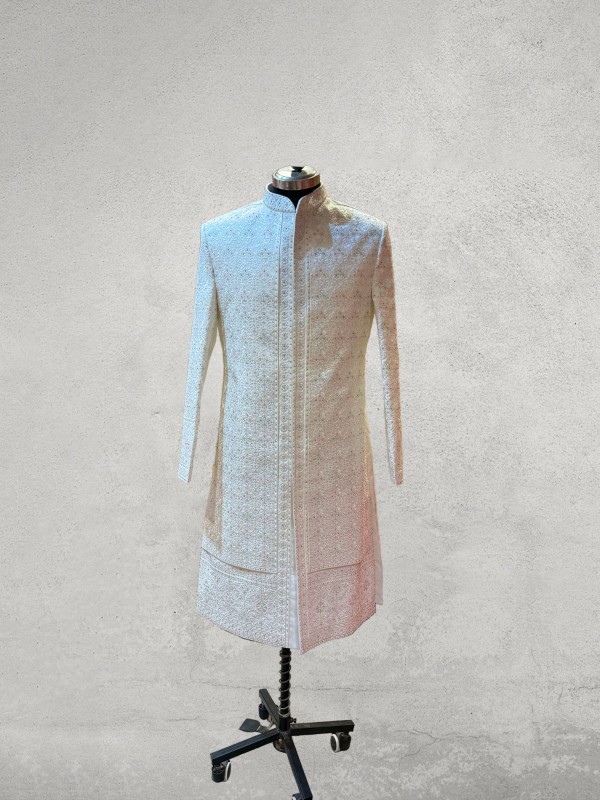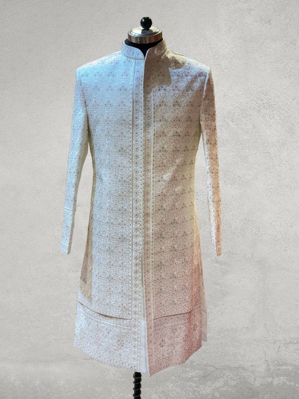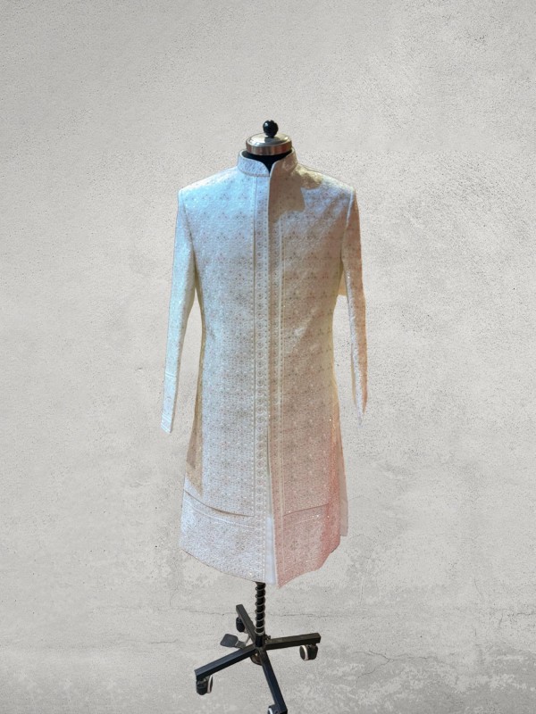 Shop our multicolour Zarkan embroidered sherwani online. This unique double layer design is perfect for grooms, featuring stunning zarkan work and a vibrant colour palette for a truly memorable wedding look.