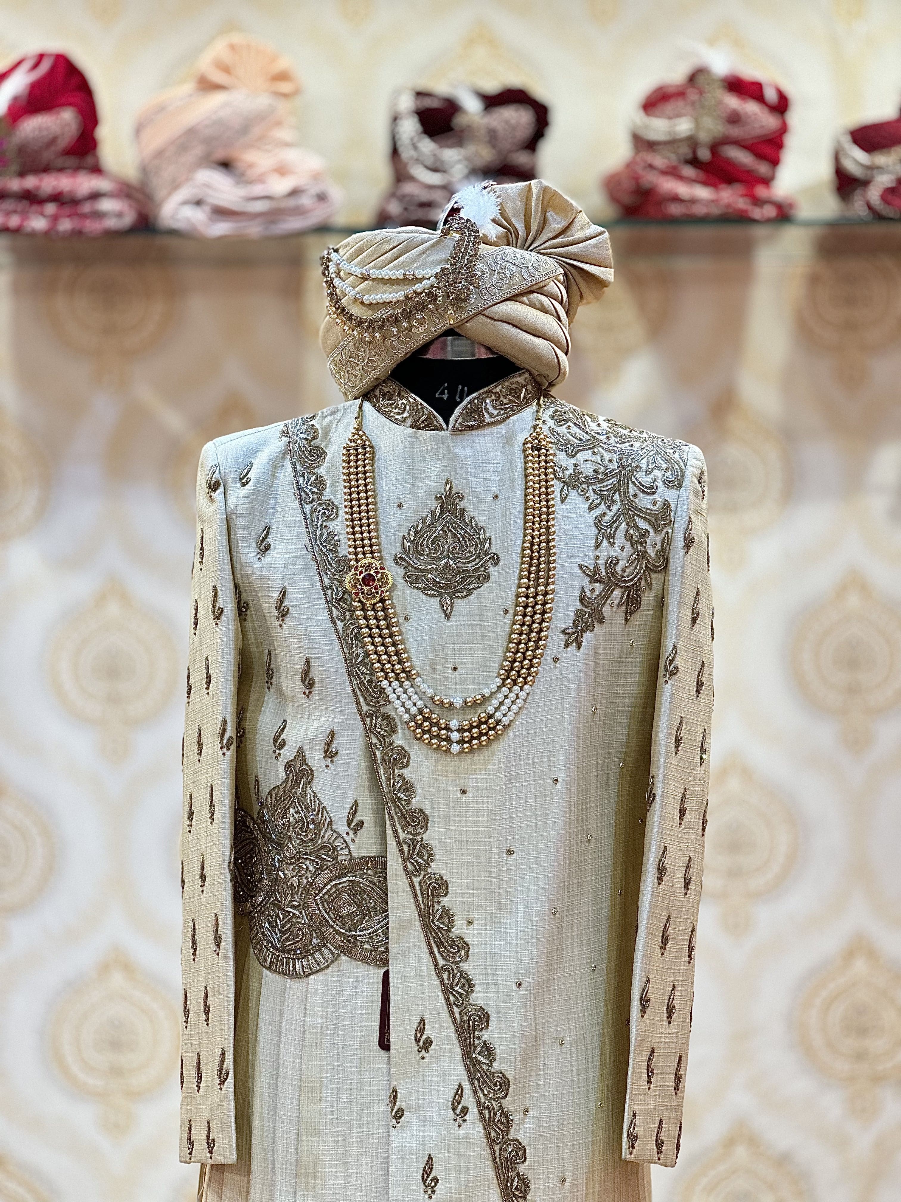 A stunning Angrakha Sherwani featuring traditional dabka work for a regal touch. Includes a pagdi, shawl, pajama, maala, and jooti.