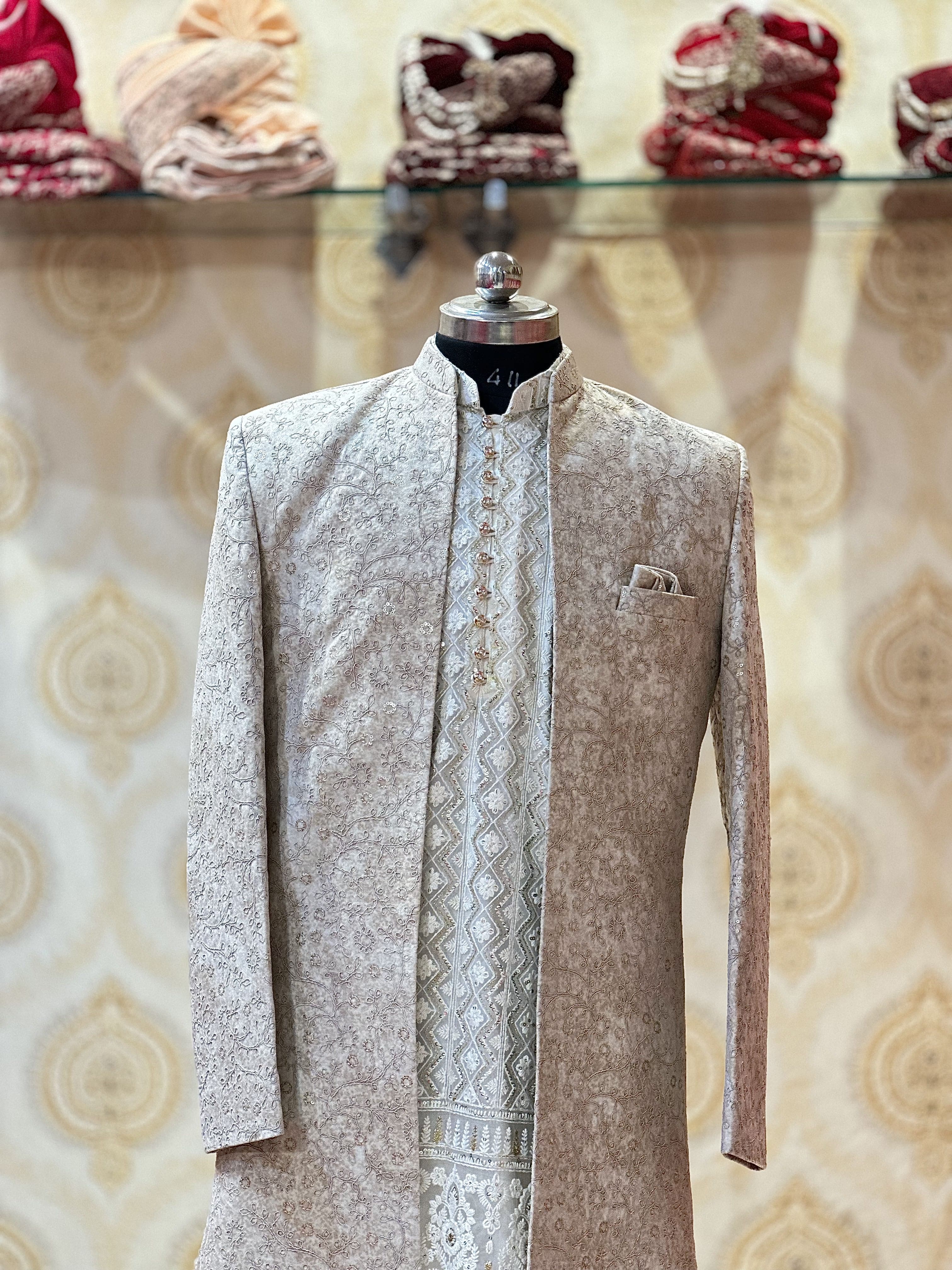 This Beige Shrug Style Sherwani blends elegance and contemporary fashion effortlessly. Includes a pagdi, shawl, pajama, maala, and jooti.