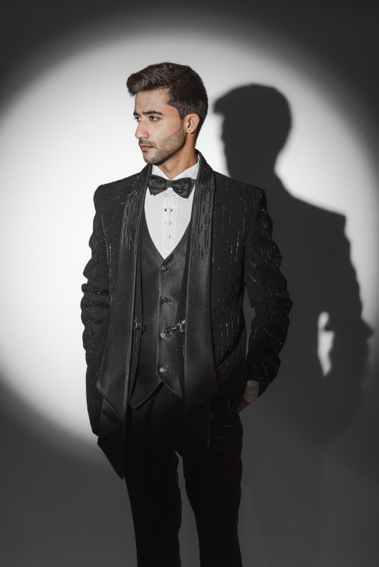 Black tuxedo with cutdana embroidery and detachable lapel