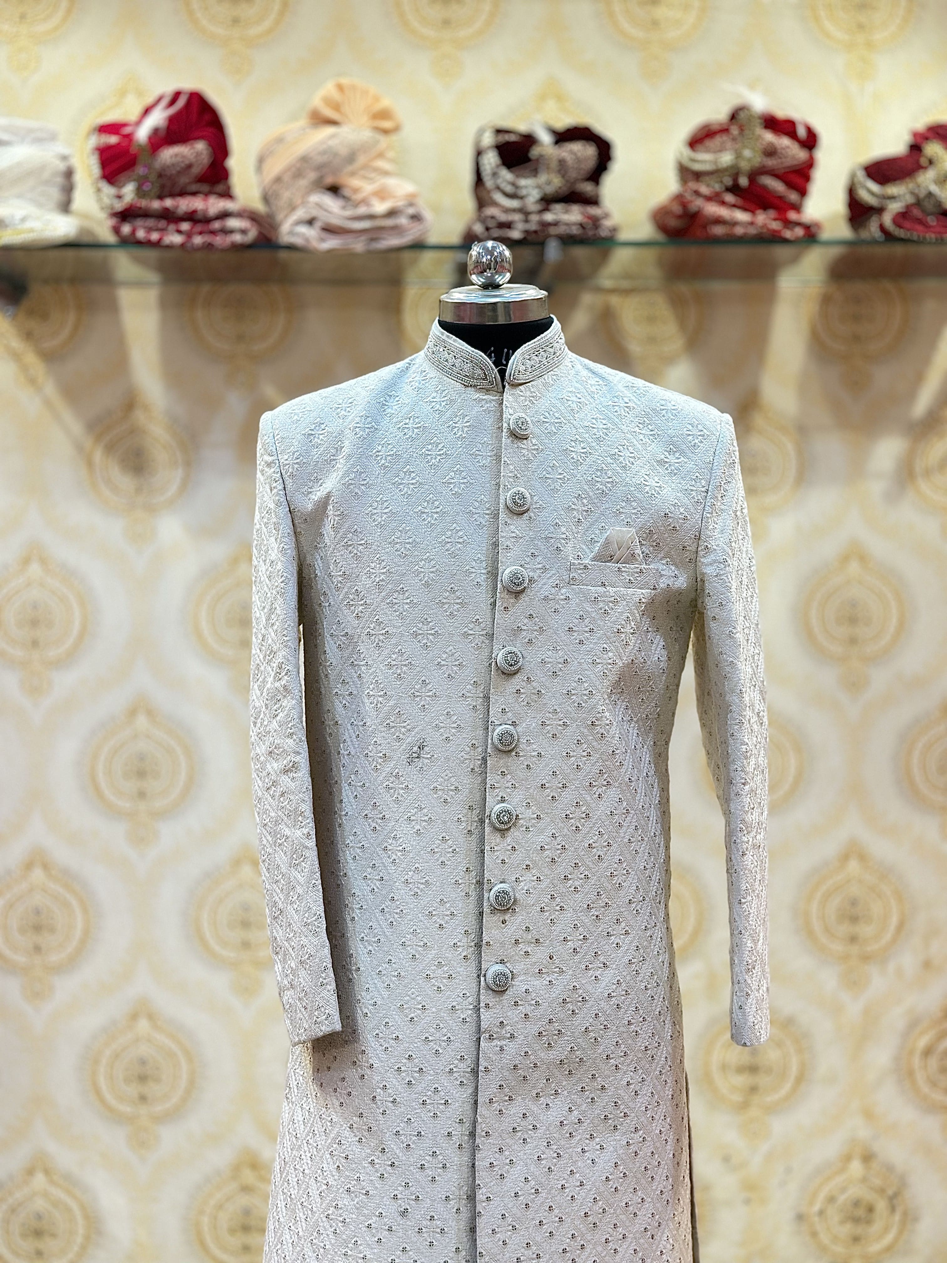 This timeless Chikankari Sherwani is an epitome of grace, featuring intricate hand-embroidered chikankari work. Comes with a pagdi, shawl, pajama, maala, and jooti.