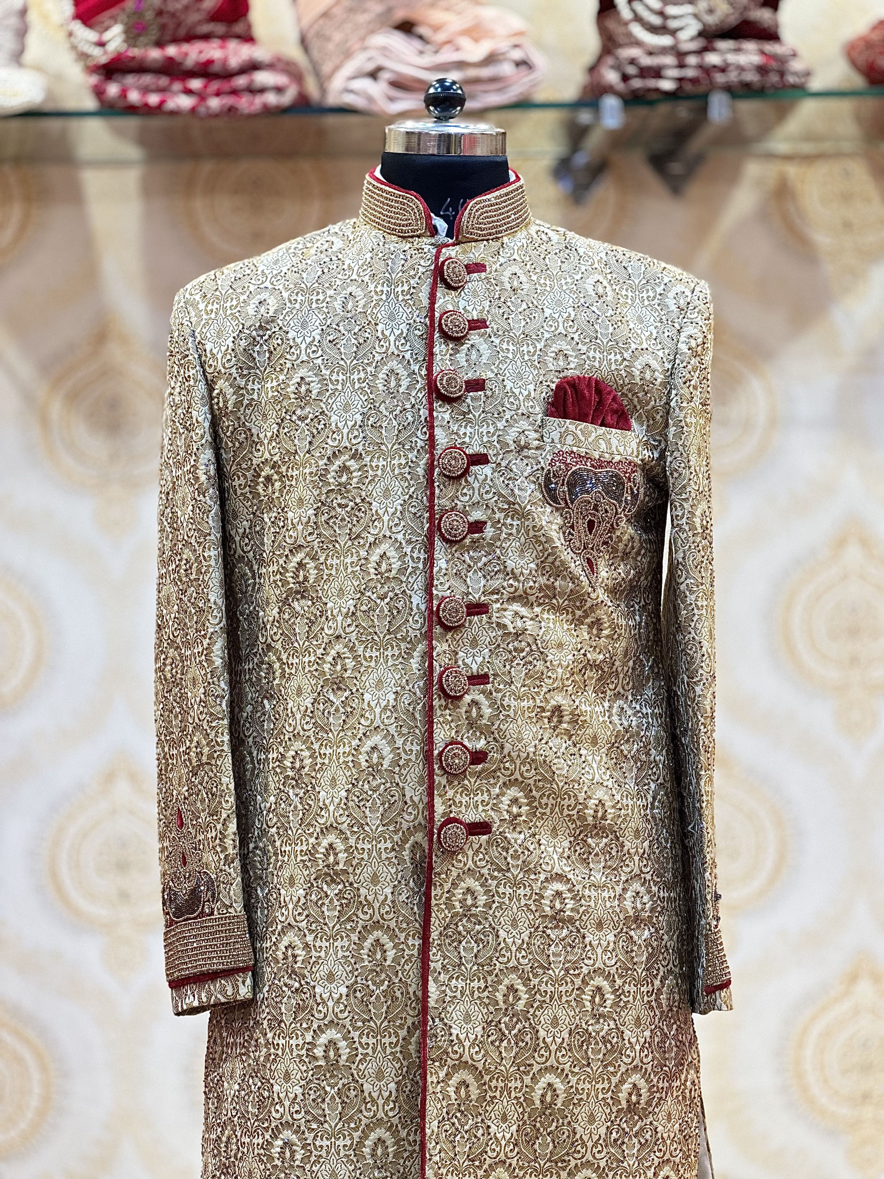 Drenched in elegance, this Dark Cutdana Sherwani is designed for the modern groom. Includes a pagdi, shawl, pajama, maala, and jooti.