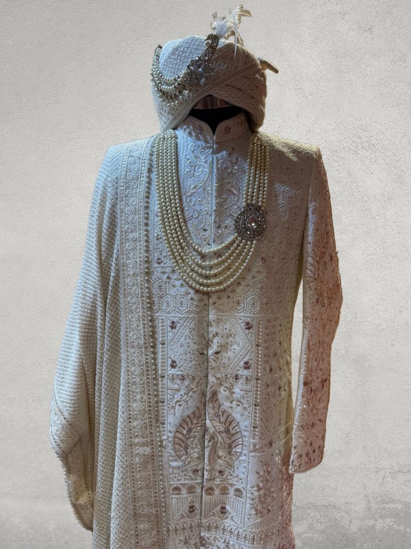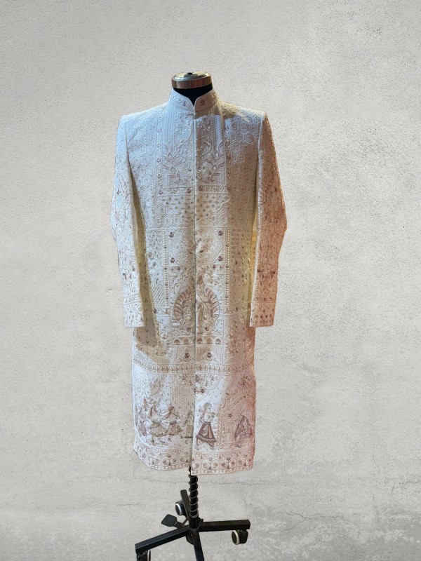 Designer Rajwada Sherwani: Experience royal elegance with our hand-embroidered Rajwada sherwani. Perfect for grooms, this traditional pattern features intricate details that capture the essence of Indian heritage and luxury.