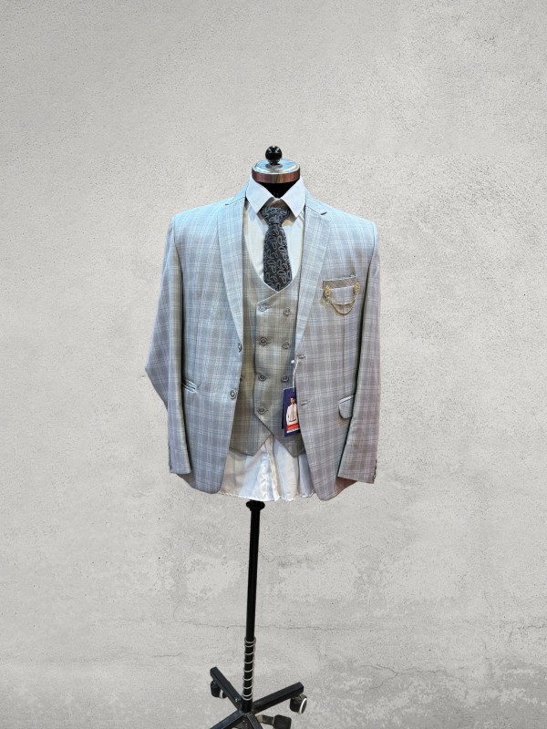 Make a statement with this expertly tailored 5-piece grey check suit. The sophisticated Italian fabric and classic check pattern create a sharp, modern silhouette that's perfect for both weddings and professional settings. This all-in-one ensemble provides everything you need to look your best.