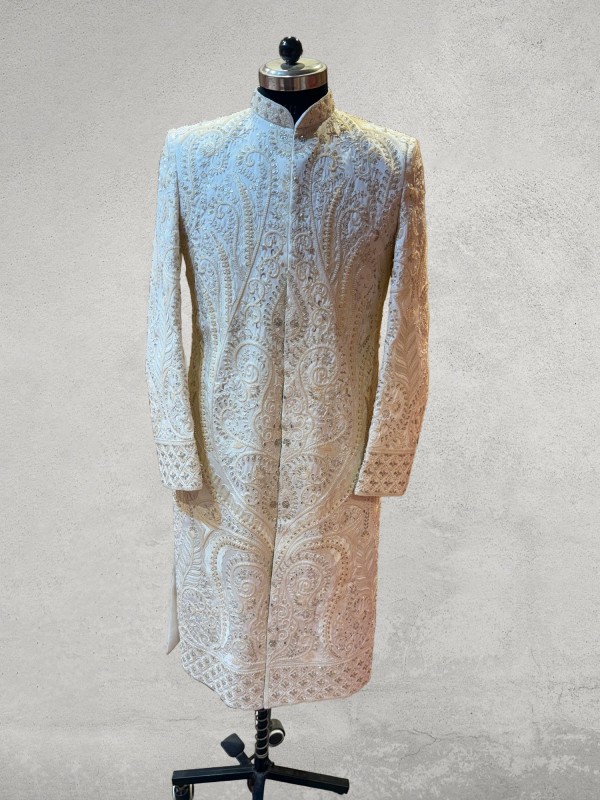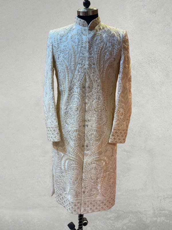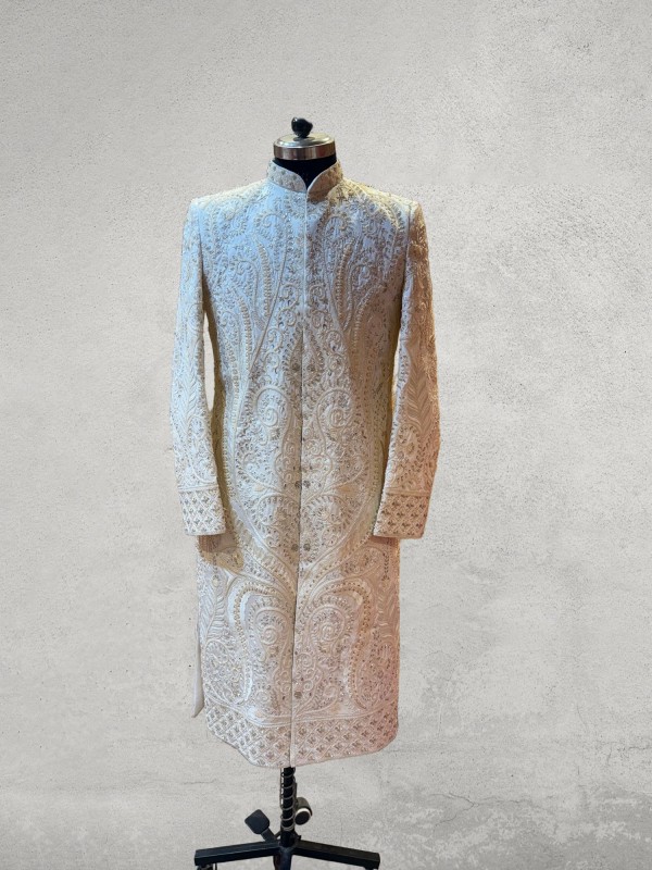 Groom's Zardozi & Dabka Sherwani: Make a statement on your wedding day with our hand-embroidered sherwanis. Each piece showcases exquisite zardozi, dabka, and cutdana work, adding a touch of royalty and luxury to your look.
