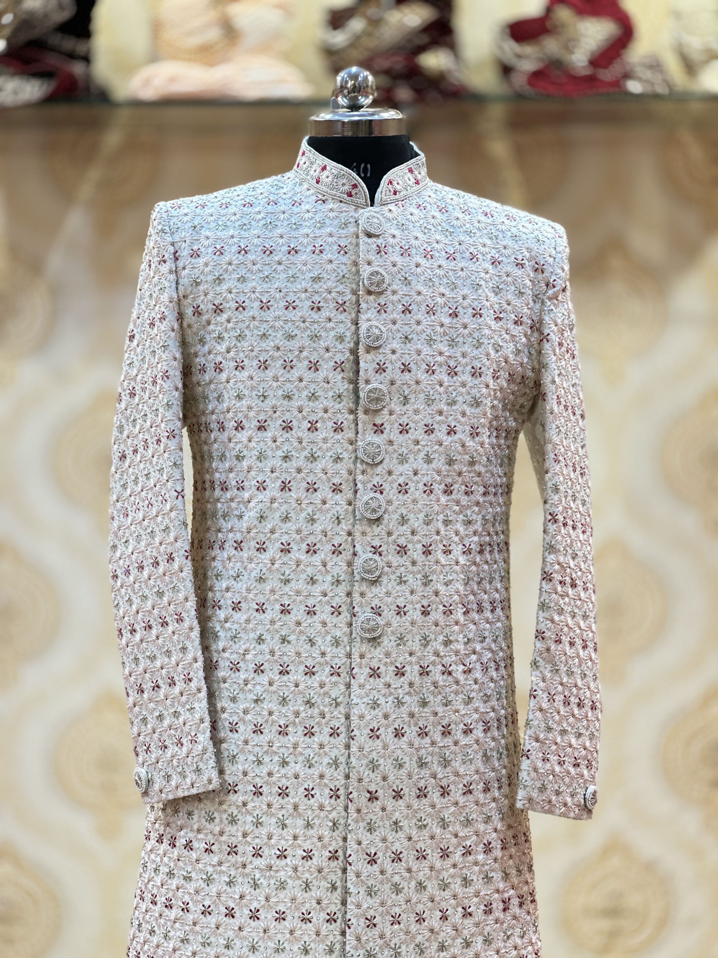 A vibrant masterpiece, this Handcrafted Multicolour Sherwani stands out with its intricate embroidery. Comes with a pagdi, shawl, pajama, maala, and jooti.