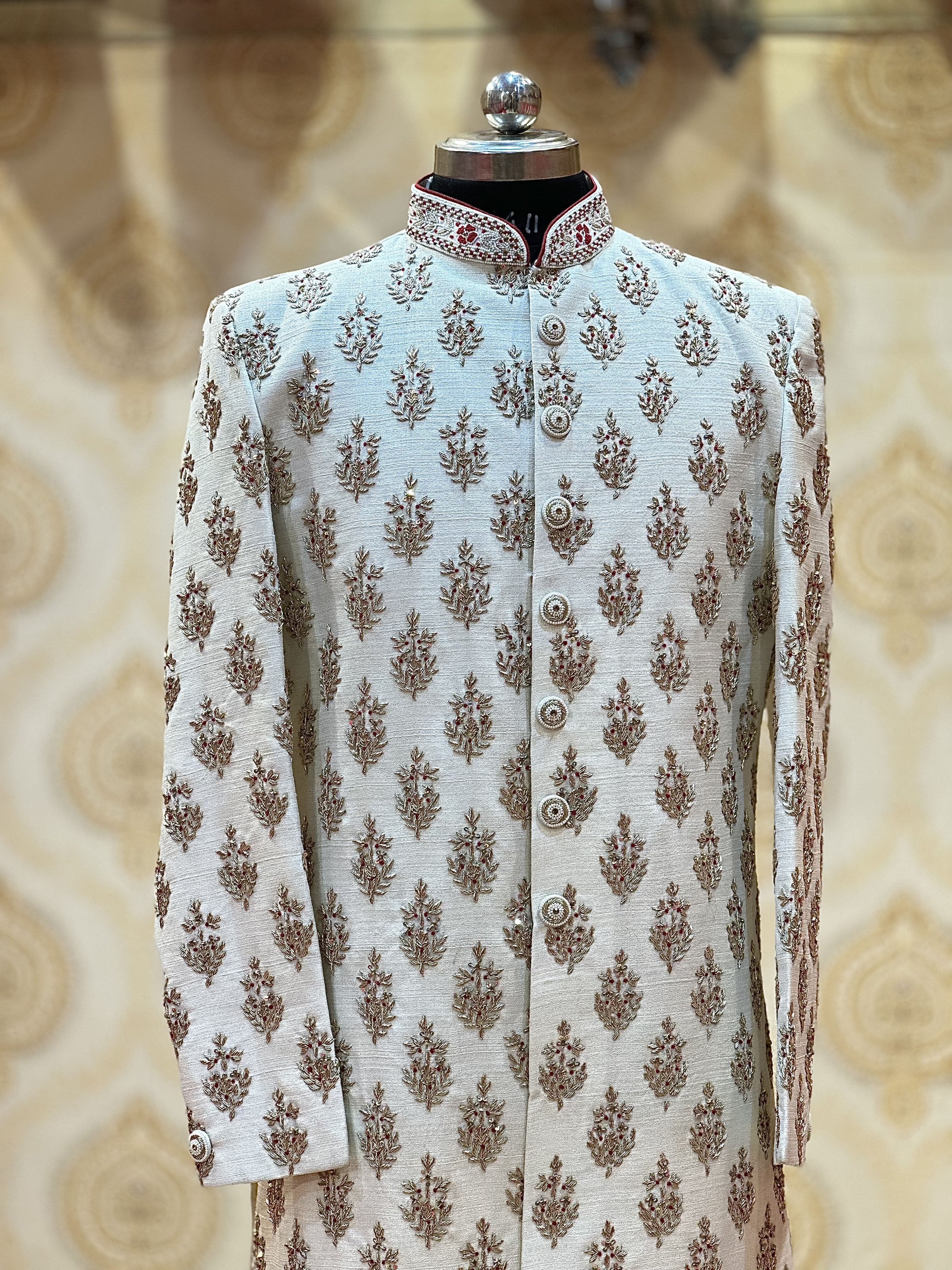The Ivory Tone Dabka Sherwani is a luxurious blend of intricate craftsmanship and royal aesthetics. Includes a pagdi, shawl, pajama, maala, and jooti.