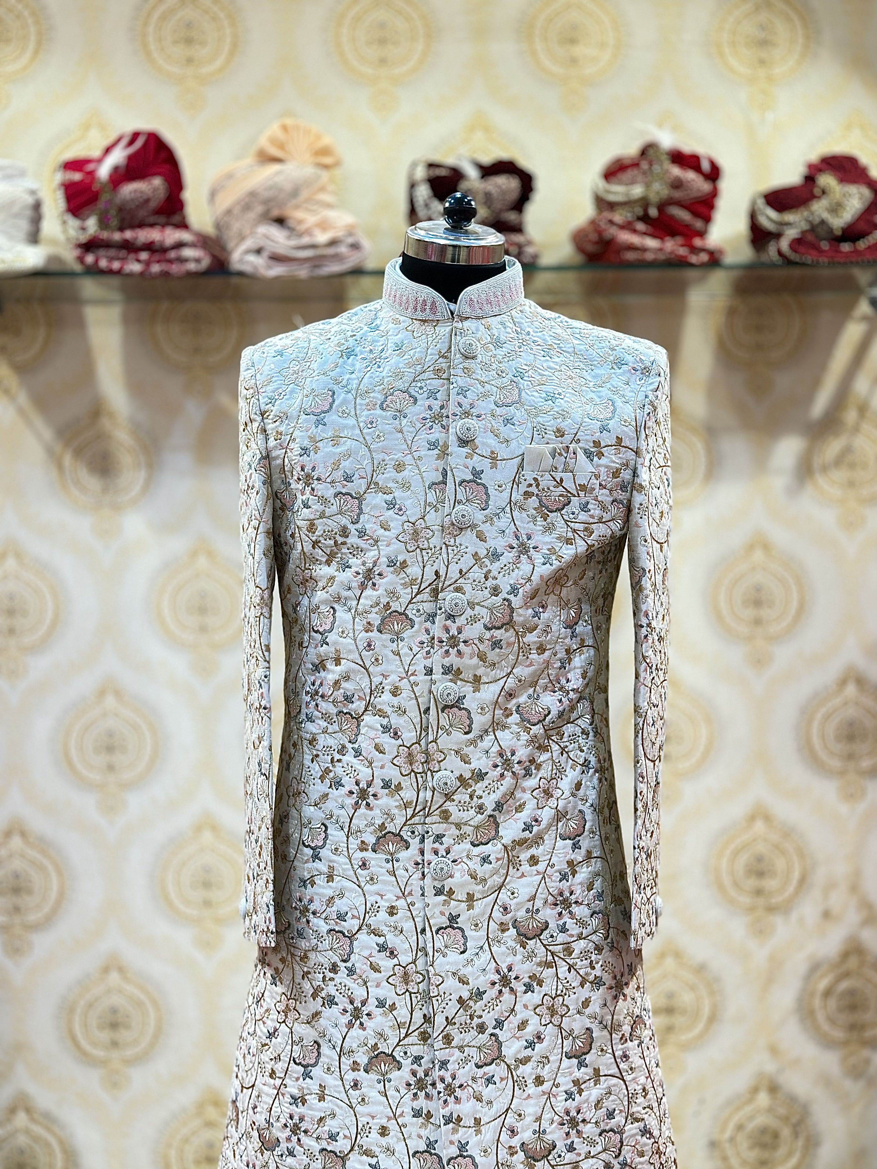 For the groom who loves vibrant hues, this Multicolour Sherwani is a celebration of rich colors. Comes with a pagdi, shawl, pajama, maala, and jooti.