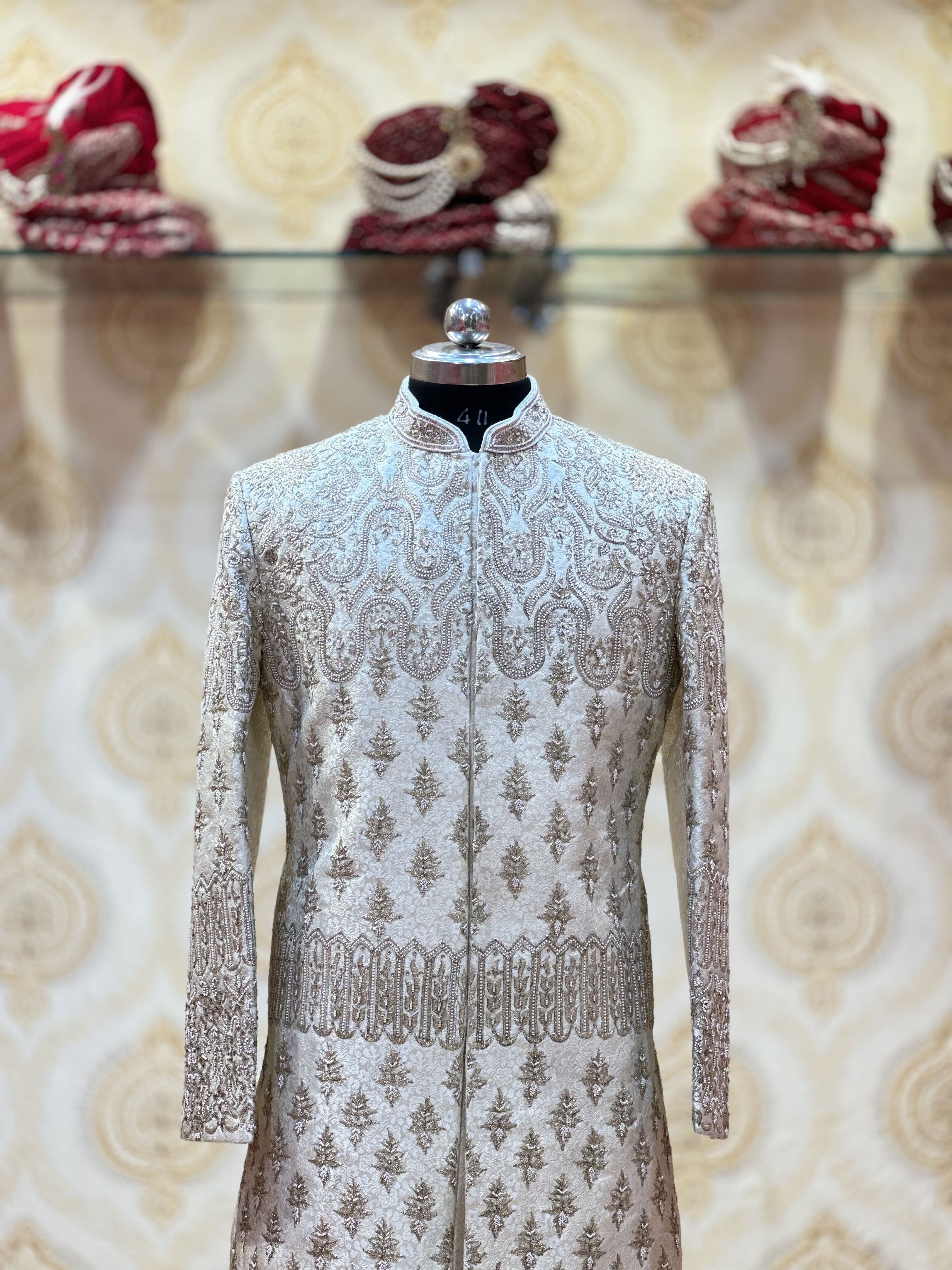 Exuding grace and sophistication, this Nawab Cut Sherwani is a symbol of aristocratic charm. Comes with a pagdi, shawl, pajama, maala, and jooti.