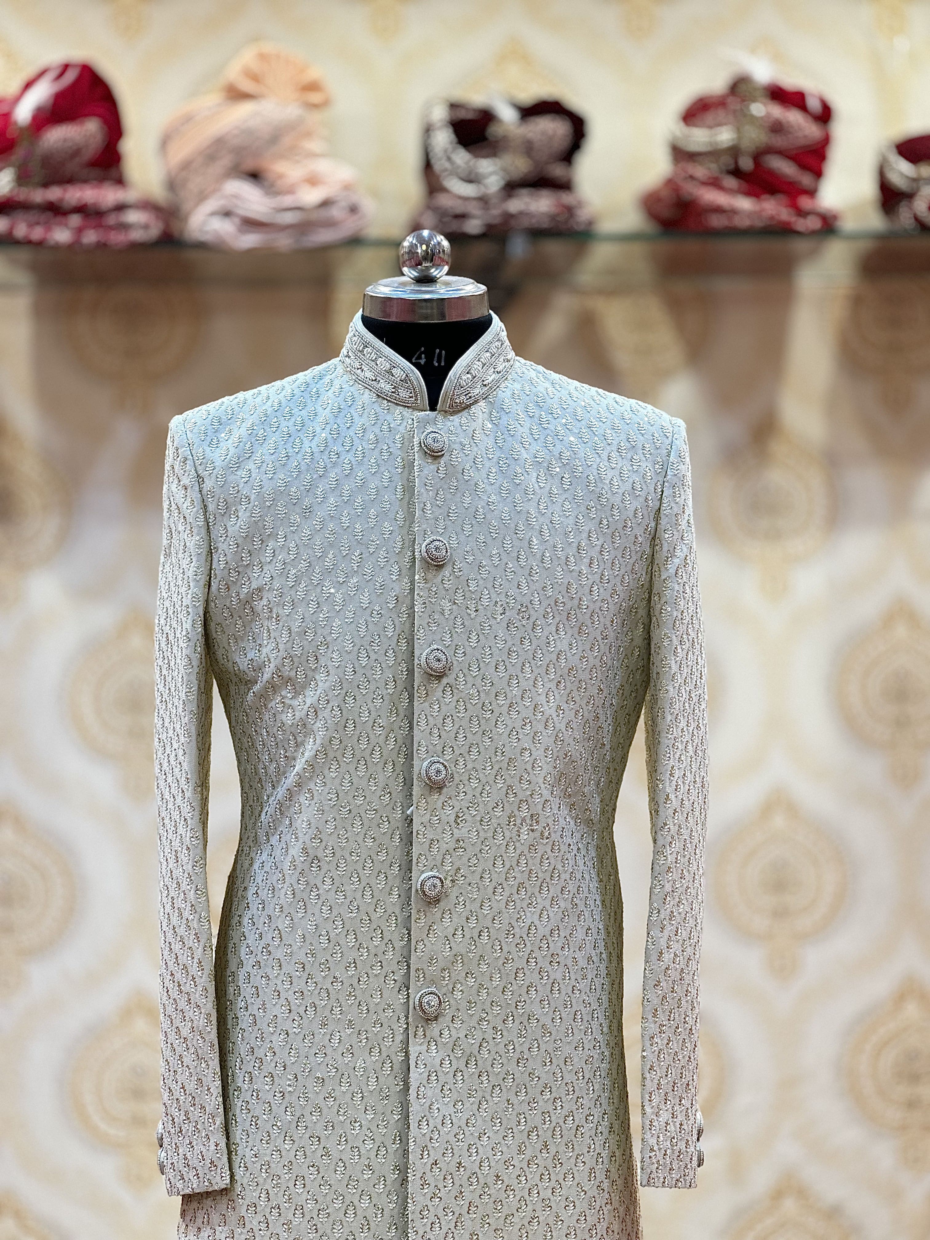 Crafted with intricate zari embroidery, this Off White Zari Sherwani exudes royal elegance. Comes with a pagdi, shawl, pajama, maala, and jooti.