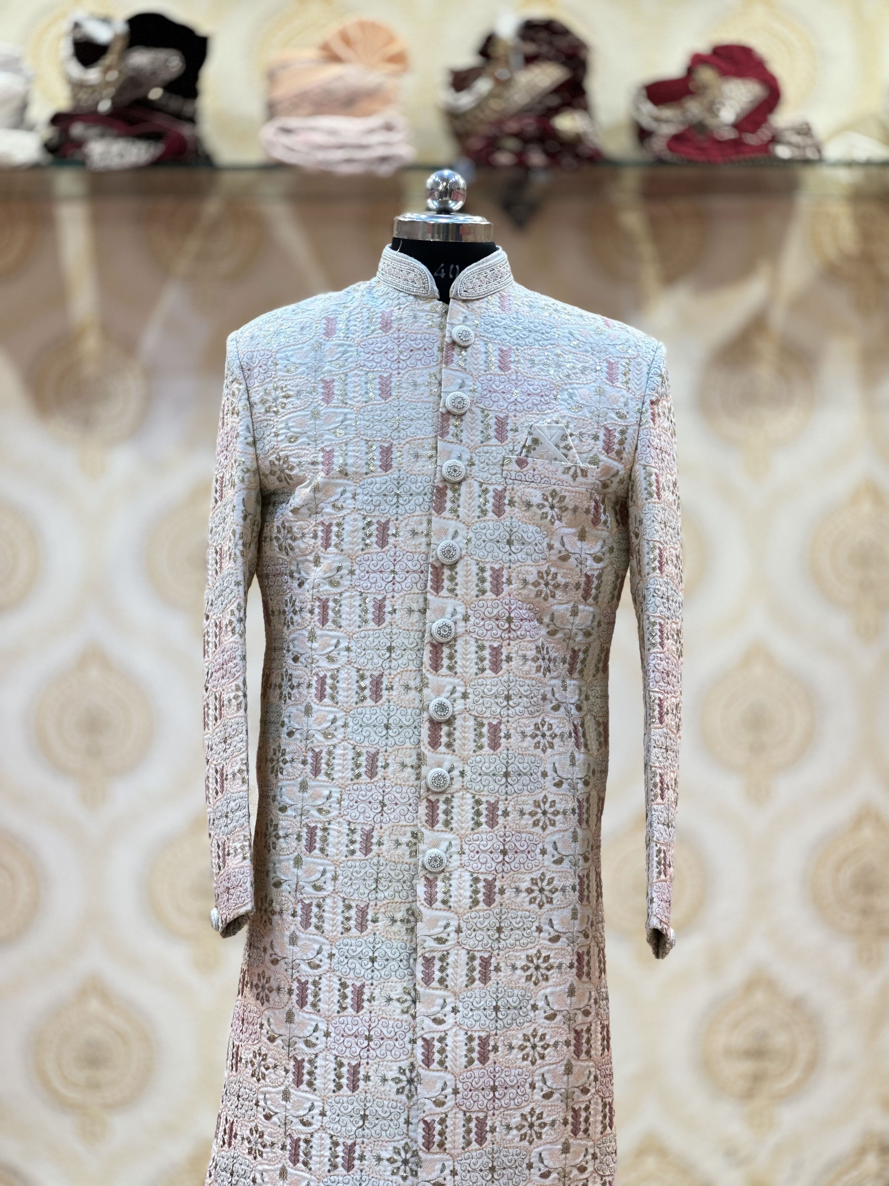 Soft yet striking, this Pastel Work Sherwani is designed for those who appreciate subtle elegance. The pastel embroidery adds a modern touch. Styled with a pagdi, shawl, pajama, maala, and jooti.