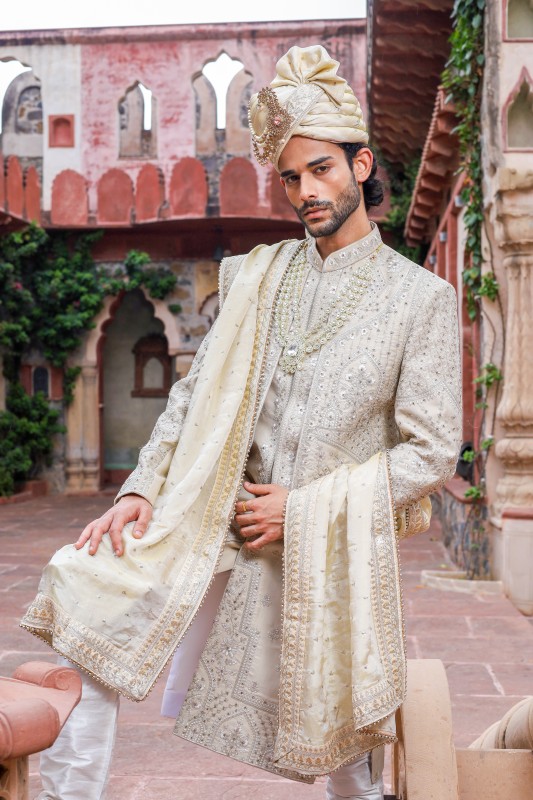 Draped in luxury, this Pista Sherwani exudes royal elegance. Comes with a pagdi, shawl, pajama, maala, and jooti.