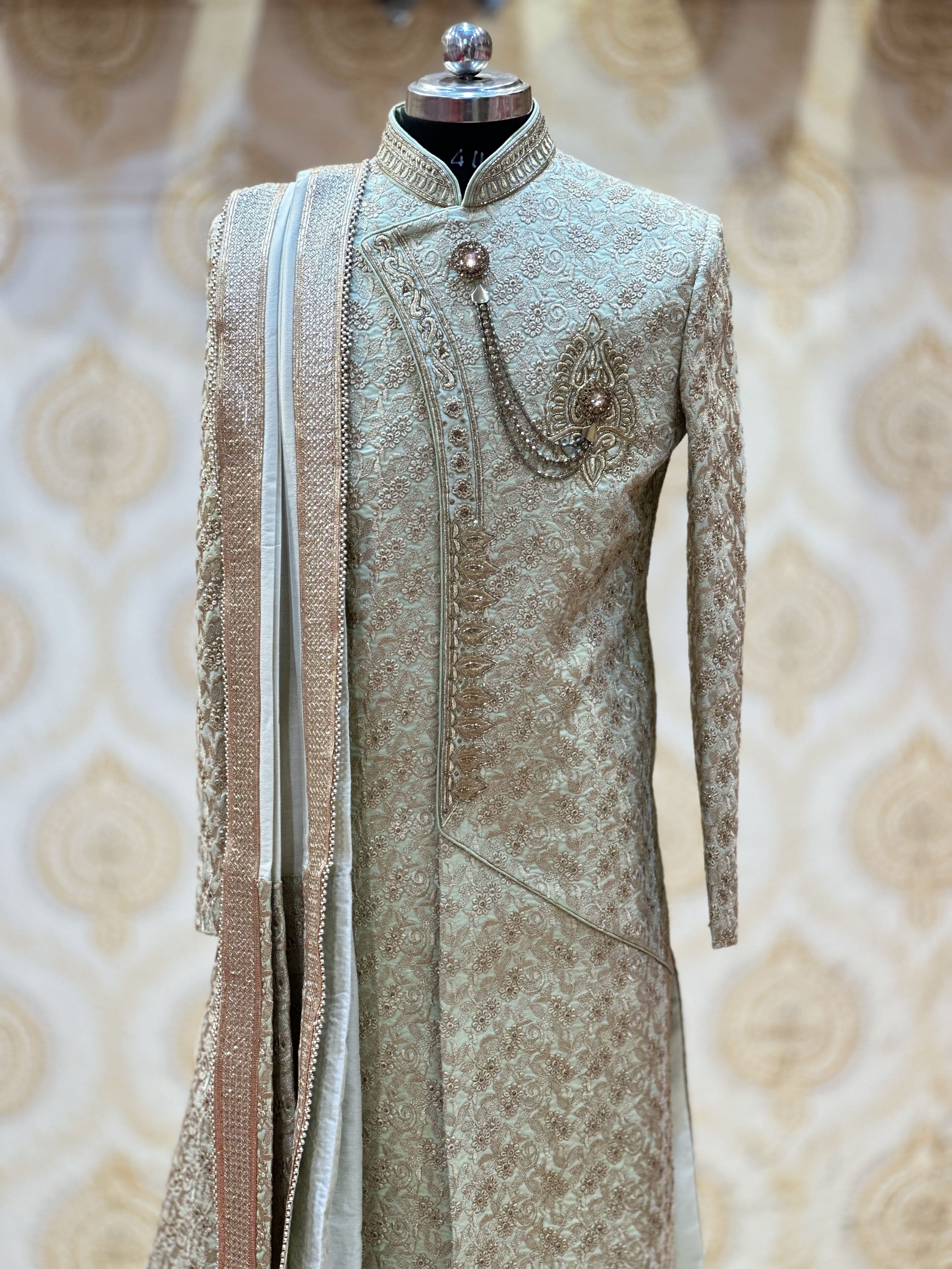 Soft and refreshing, this Pistachio Angrakha Sherwani offers a unique pastel charm. Includes a pagdi, shawl, pajama, maala, and jooti.