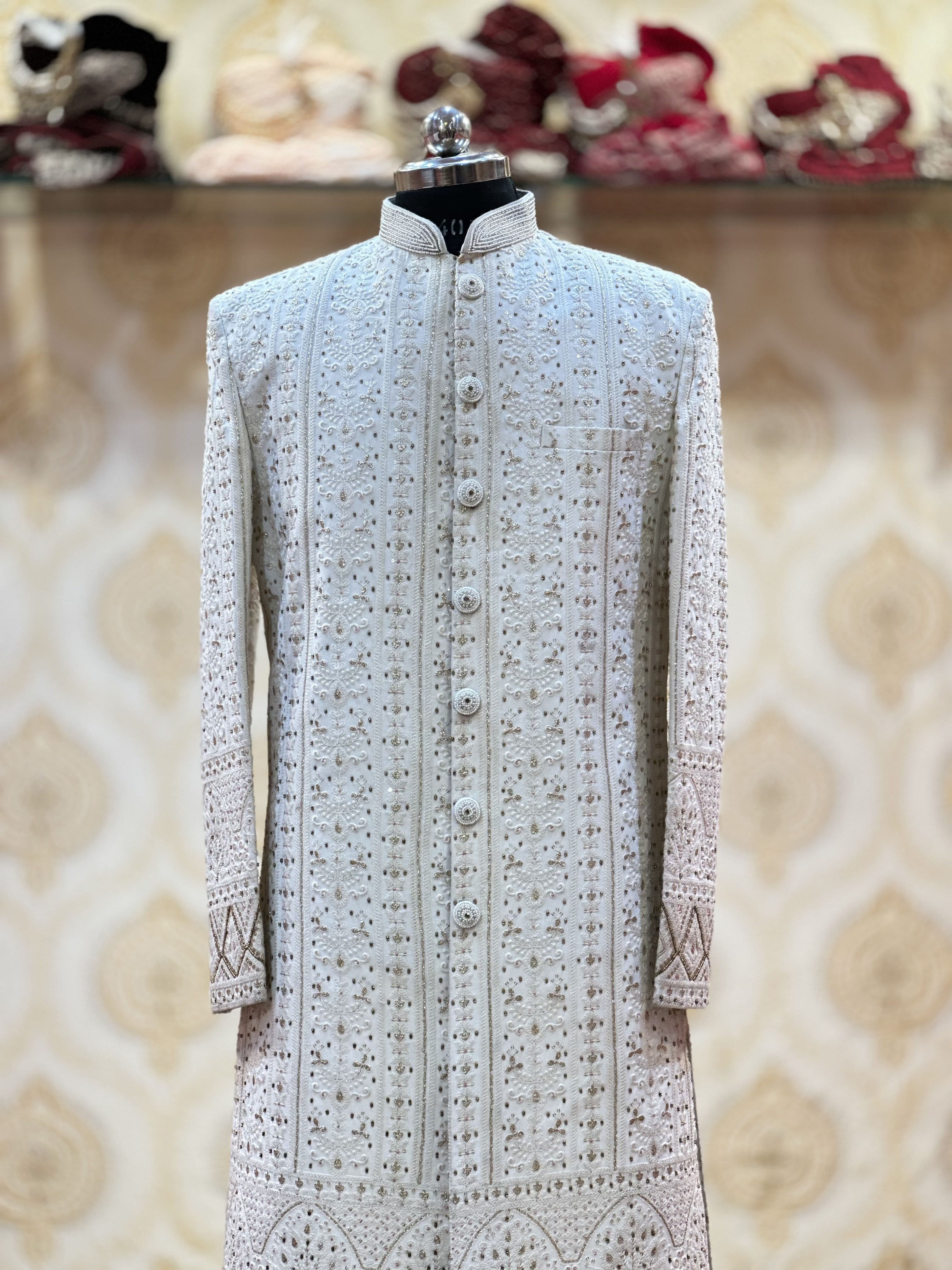 A touch of royalty defines this Rajwada Golden Touch Sherwani, featuring majestic embroidery. Comes with a pagdi, shawl, pajama, maala, and jooti.