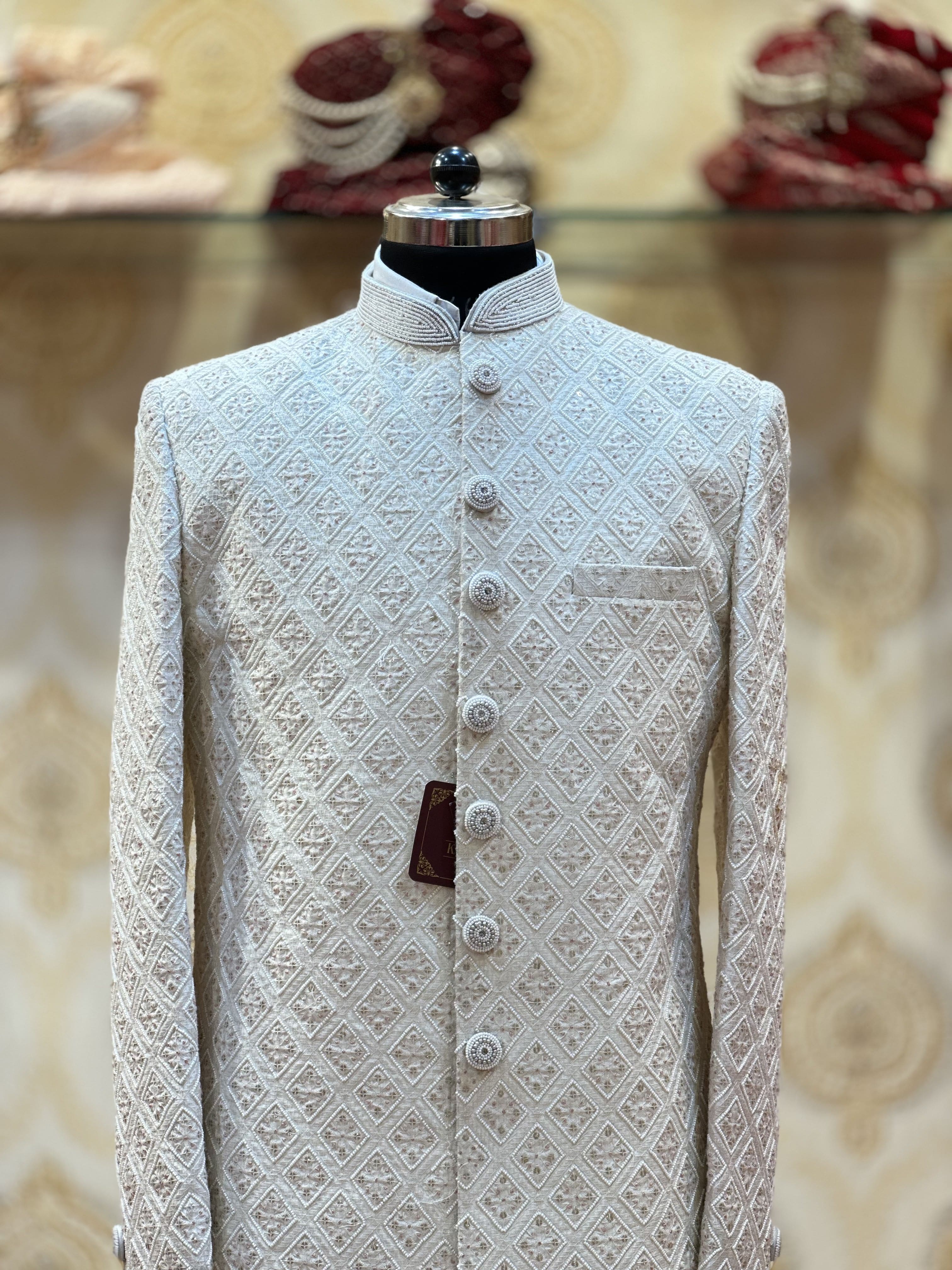 Rich in tradition, this Resham Work Handcrafted Sherwani showcases fine craftsmanship. Includes a pagdi, shawl, pajama, maala, and jooti.