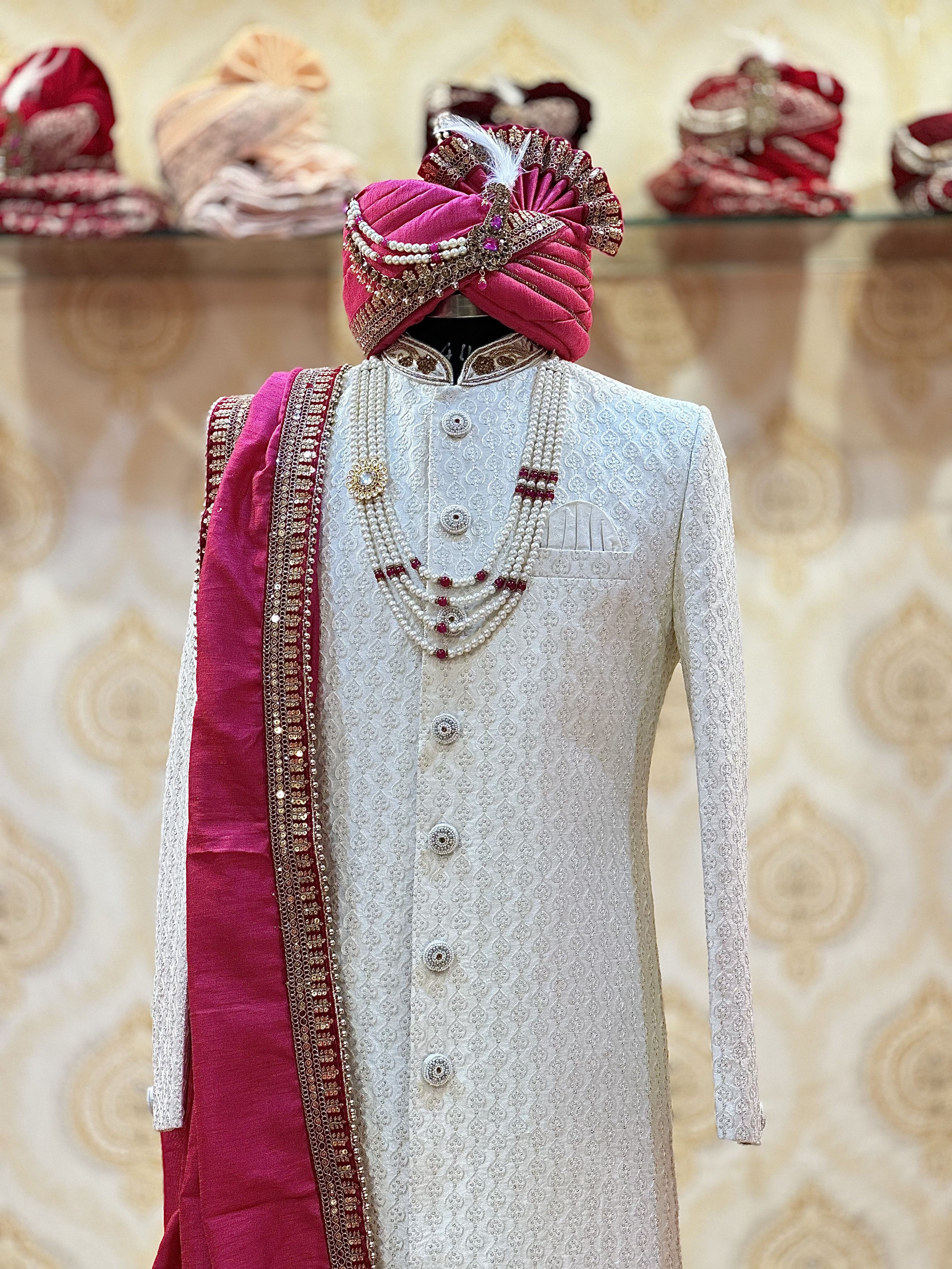 Rich resham embroidery lends this sherwani an exquisite appeal. Comes with a pagdi, shawl, pajama, maala, and jooti.