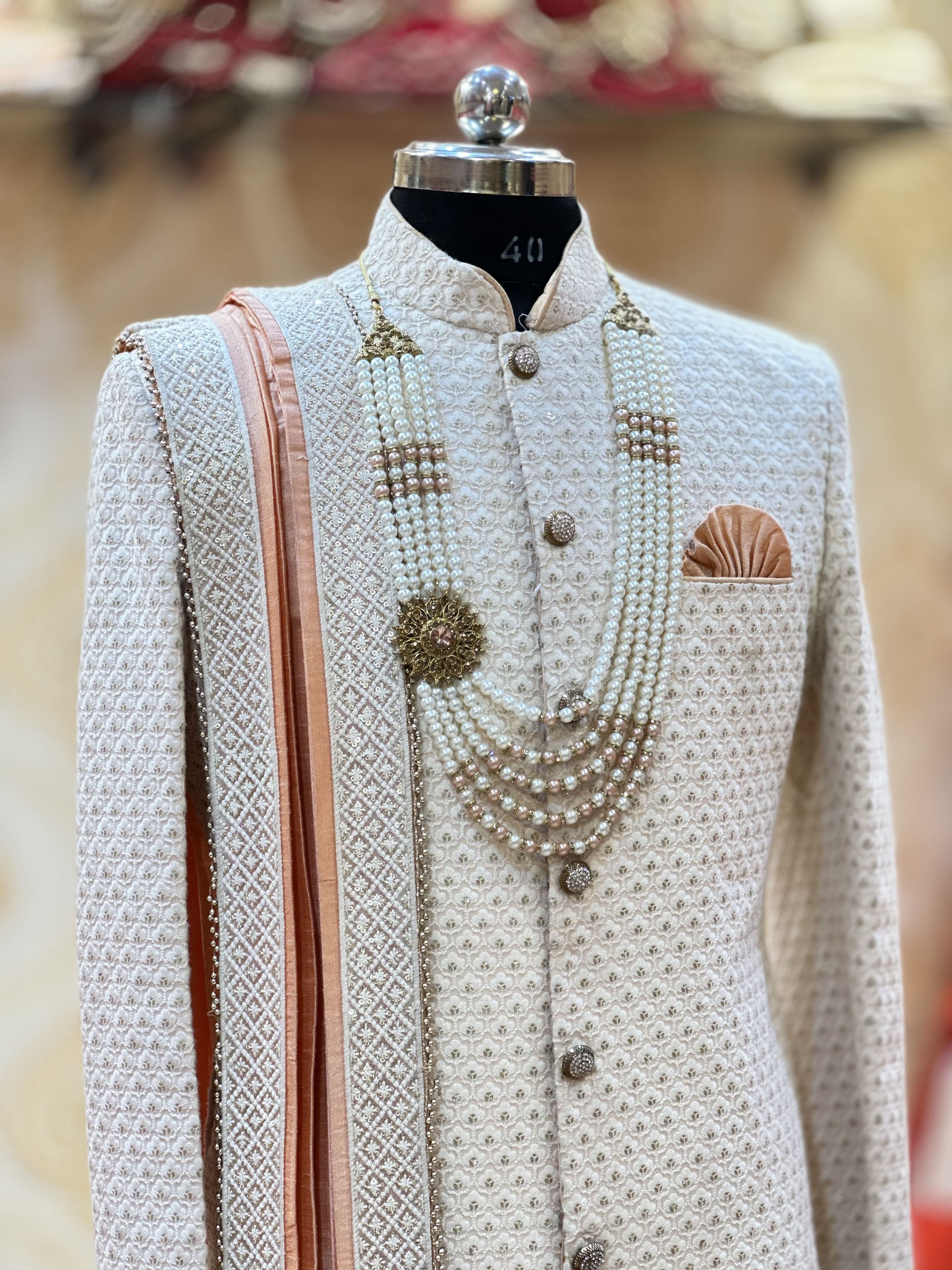 The Rose Gold Chikankari Sherwani is an exquisite blend of heritage and sophistication. Includes a pagdi, shawl, pajama, maala, and jooti.