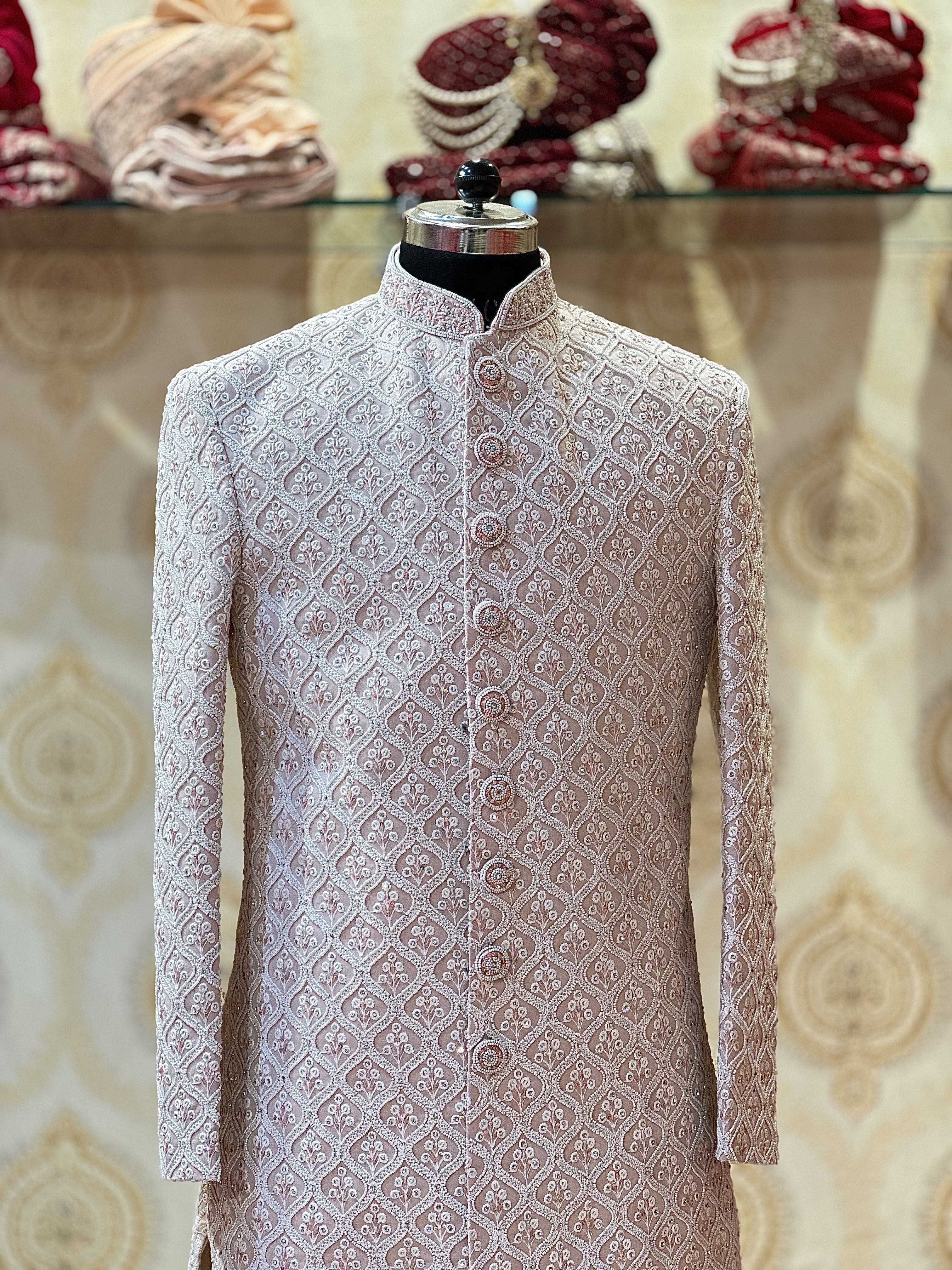 Designed with meticulous handcrafted details, this Salmon Pink Sherwani is a masterpiece of tradition. Comes with a pagdi, shawl, pajama, maala, and jooti.