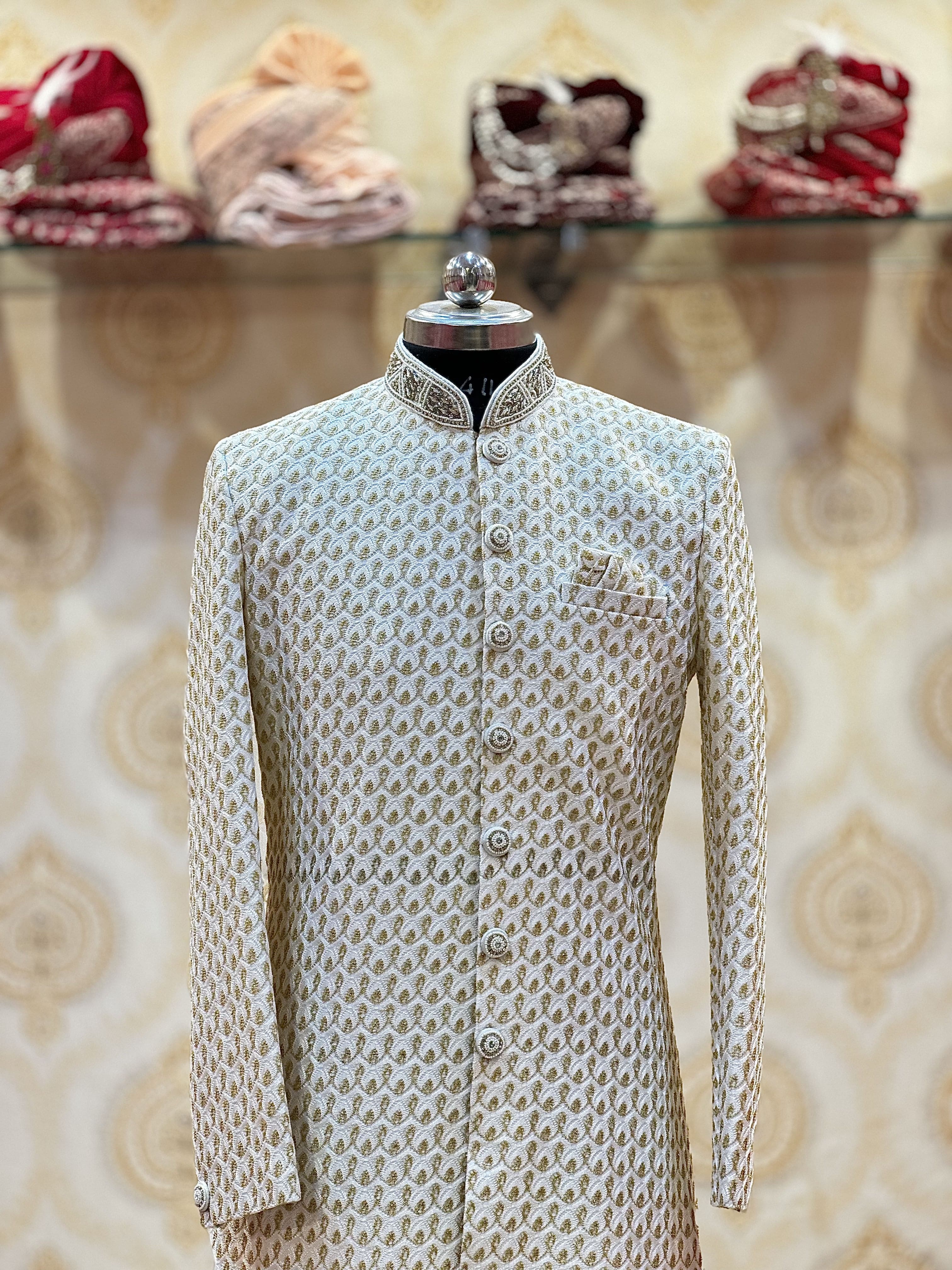 Step into elegance with this Zari Work Ivory Sherwani, featuring delicate zari embroidery. Comes with a pagdi, shawl, pajama, maala, and jooti.