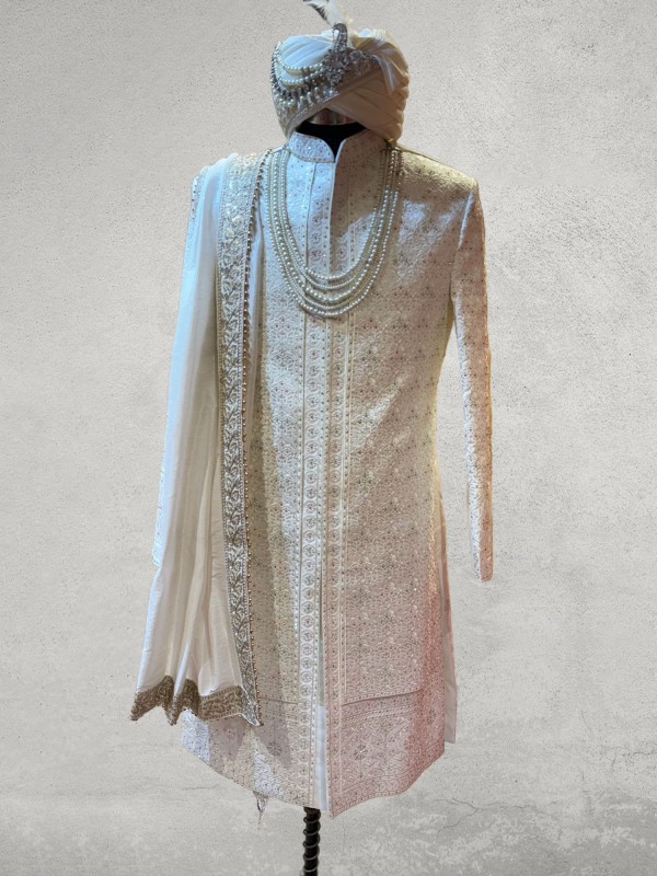 Shop our multicolour Zarkan embroidered sherwani online. This unique double layer design is perfect for grooms, featuring stunning zarkan work and a vibrant colour palette for a truly memorable wedding look.